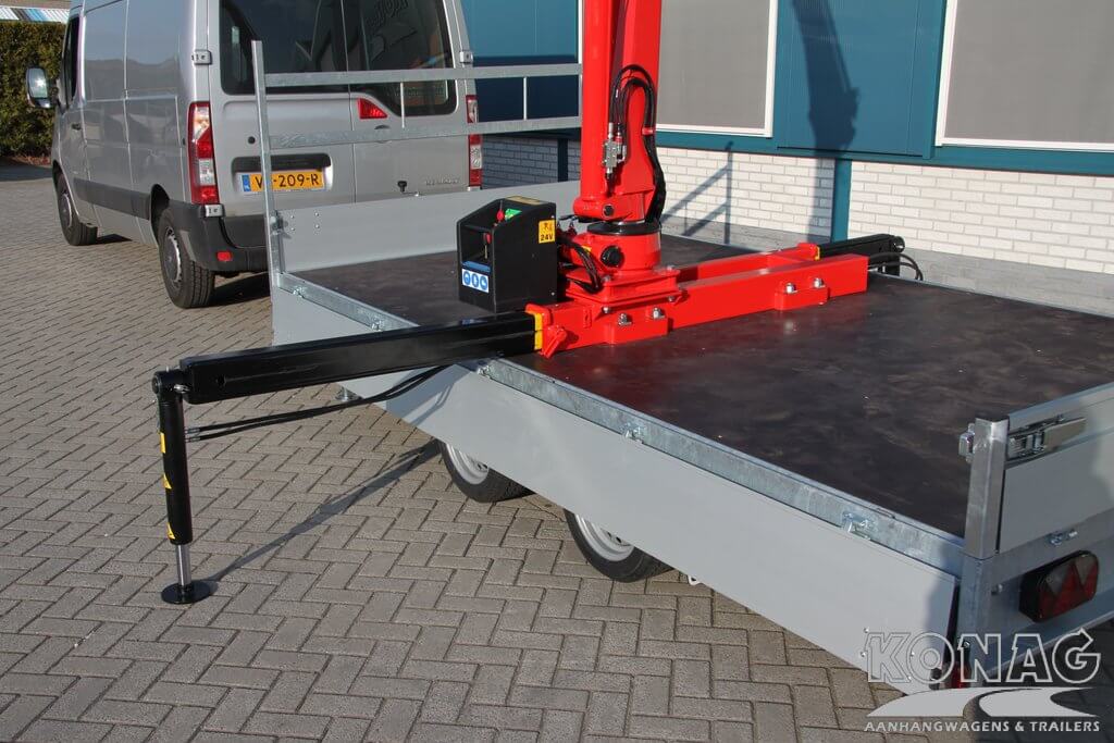 Grote Konag plateauwagen met optionele aanhangwagenkraan. Deze hydraulische kraan is volledige elektrisch / hydraulisch te bedienen.