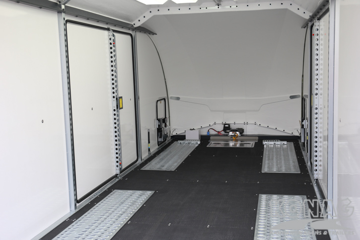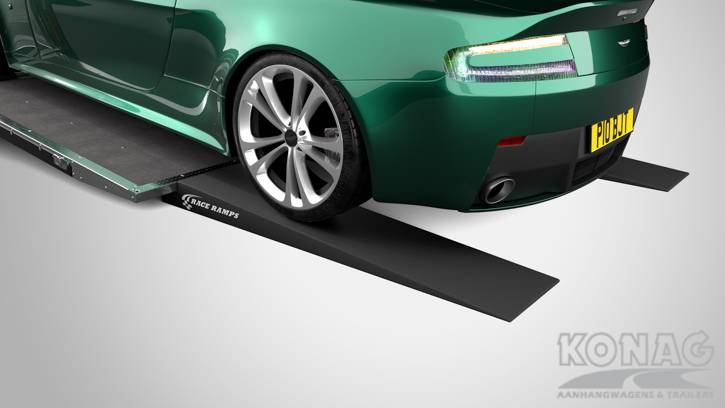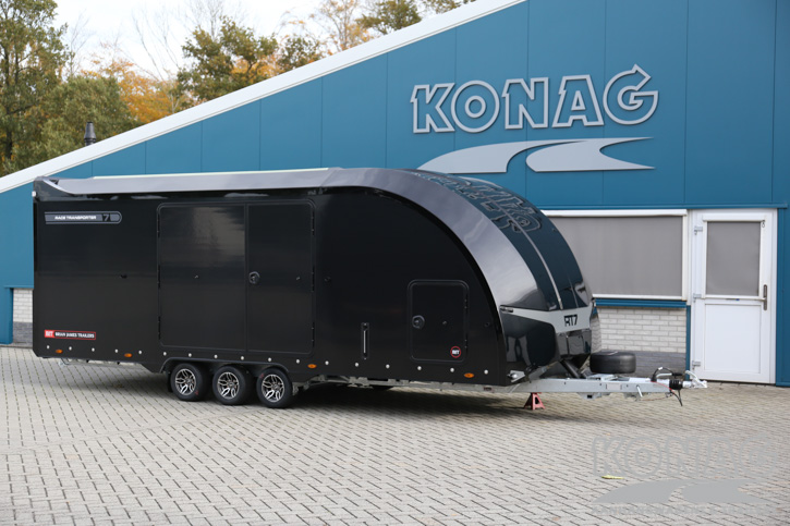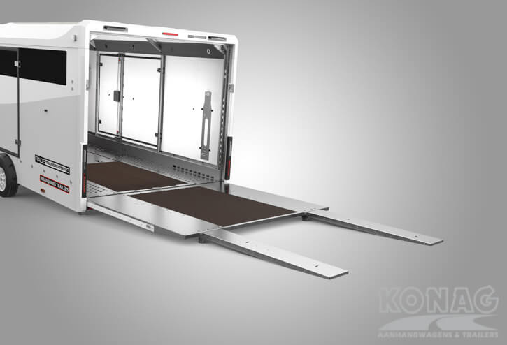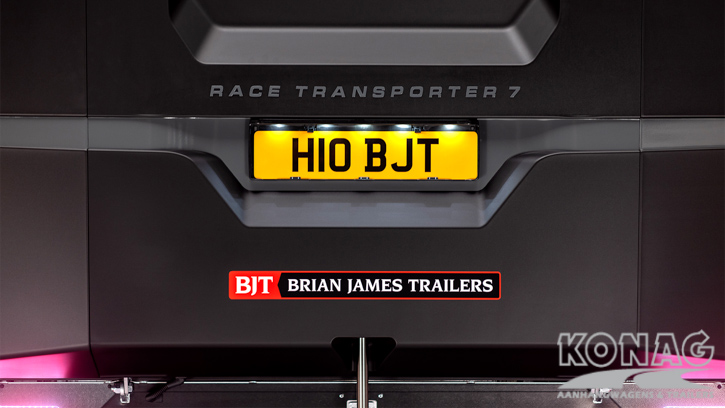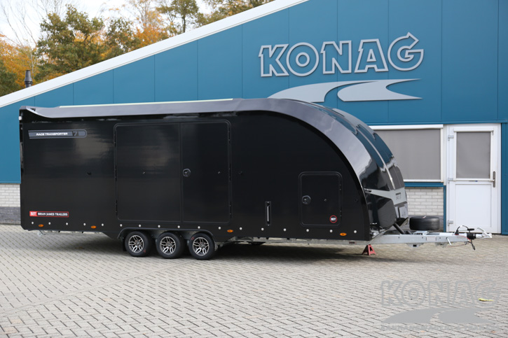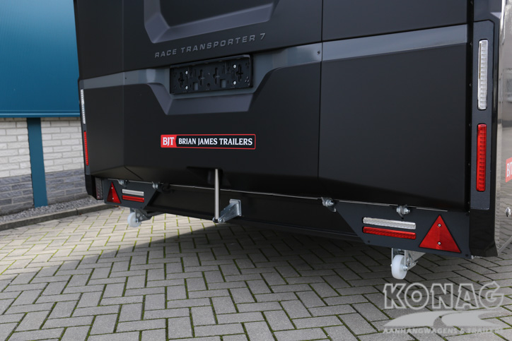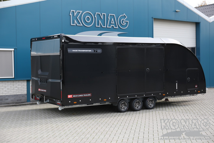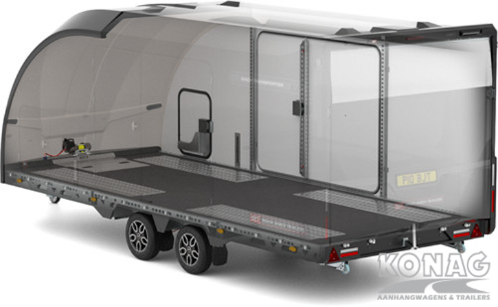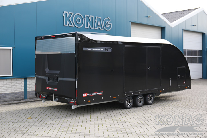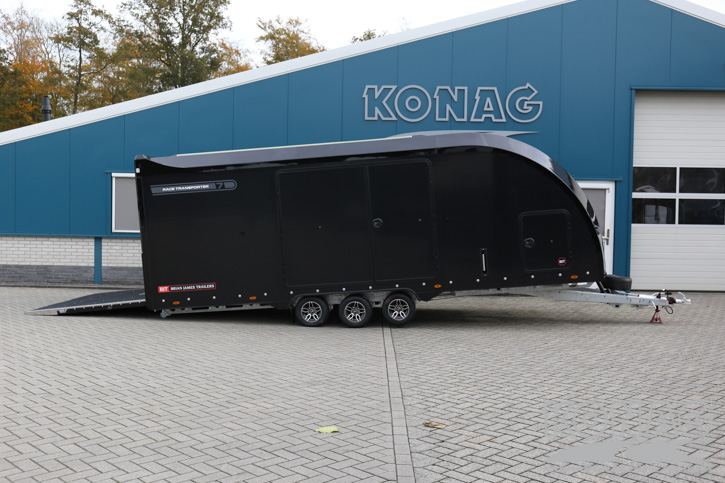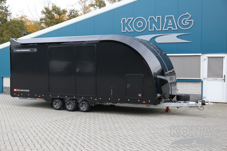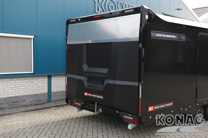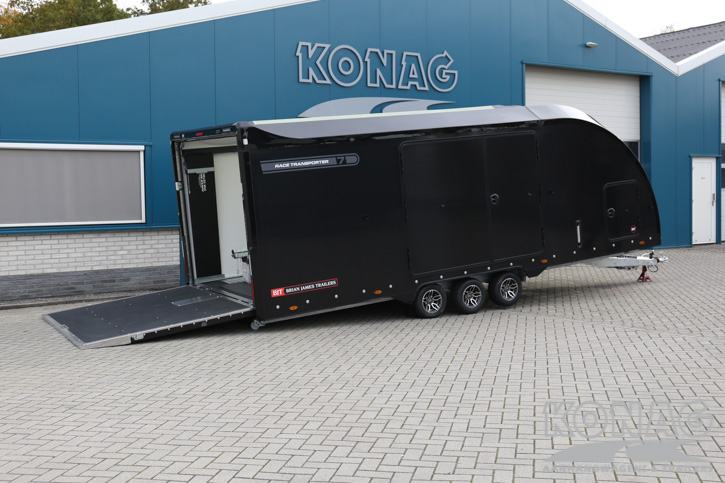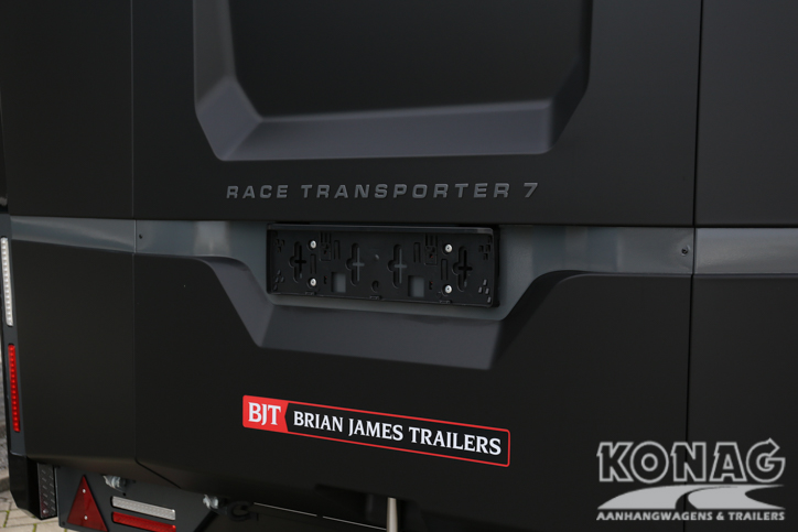 Brian James Trailers Race Transporter 7. Autotransport op een hoog niveau. Deze Brian James RT7 gemaakt met geavanceerde lichtgewicht materialen waardoor u zwaardere auto’s kunt vervoeren. De Race Transporter 7 is uitgevoerd met een op afstand bedienbare laadklep en kantelvloer maar kan eveneens in de elektrische controle hub bediend worden. Dankzij de toegangsluiken en deuren, kunt u gemakkelijk in en uit de auto stappen en is het gemakkelijk om de auto vast te zetten. Deze compleet vernieuwde autotransporter is rijkelijk uitgerust met functies zoals een elektrische lier met accu, Hi-visibility LED verlichting en een lichtdoorlatend dak. De trailer heeft een inwendige maatvoering van 616x230x188cm (LxBxH). Deze luxe gesloten autotransporter is uitgevoerd met een opbergkist in de vloer maar is naar wens ook nog uit te breiden met bijvoorbeeld een Brian James bandenrek RT.