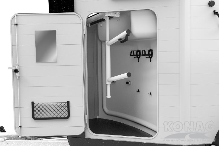 Afsluitbare zadelkamer met uitschuifbare zadelhouder, hoofdstelhouder, spiegel, net, interieurverlichting, schep en bezem