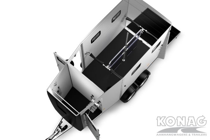 De afsluitbare zadelkamer biedt voldoende ruimte voor uw gehele uitrusting. Met de uitklapbare zadelhouder, hoofdstelhouder, opbergmogelijkheden en klapstoel heeft u alles overzichtelijk bij de hand. Dit maakt de trailer geschikt voor zowel dagelijks gebruik als bij wedstrijden. Binnenin is de trailer ingericht met oog voor veiligheid en comfort. De verstelbare borst- en bilstangen met EquiGuard® panieksluiting en de stevige AluBiComp vloer met verlijmde rubbermat zorgen voor een stabiele basis. Het ventilatiesysteem en de schuiframen zorgen voor voldoende frisse lucht tijdens het transport.