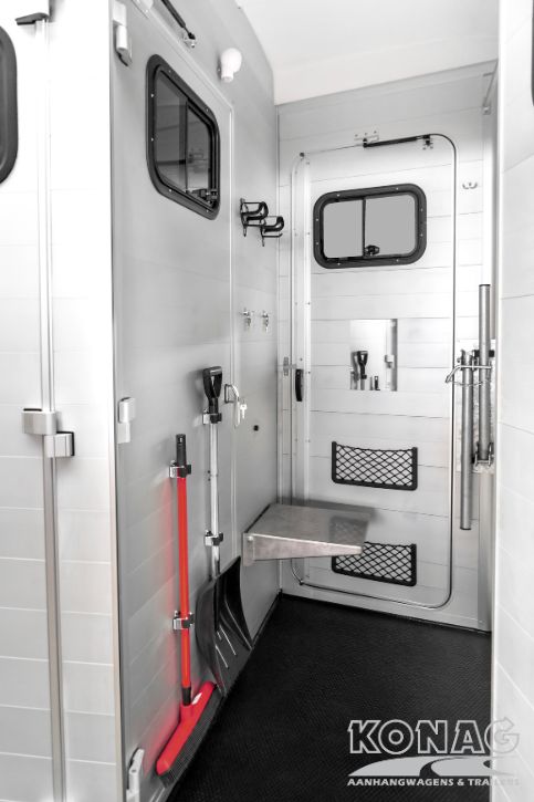 Afsluitbare inloopzadelkamer met uitklapbare zadelhouder en klapstoel, hoofdstelhouder, spiegel, opbergnet, interieurverlichting, schep en bezem