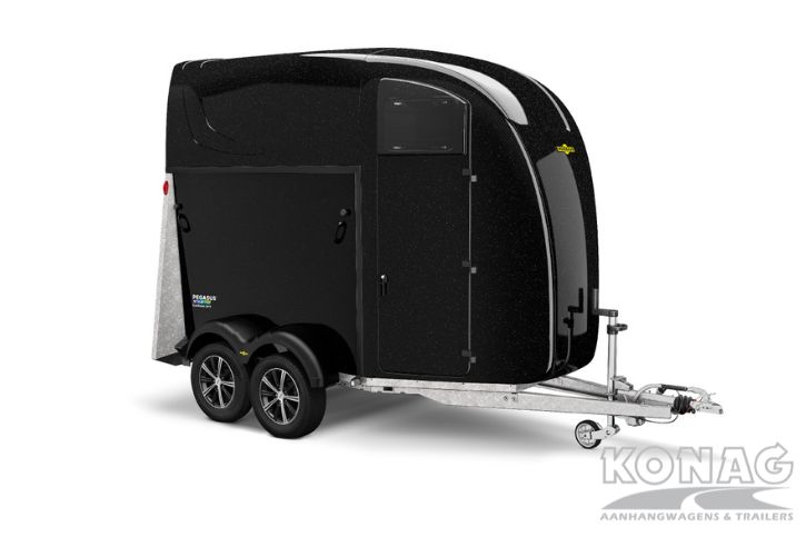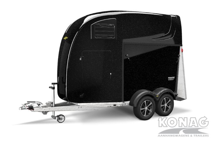 De polyester opbouw in Black Metallic geeft de trailer een moderne uitstraling. De getinte uitzetramen zorgen voor voldoende lichtinval en ventilatie in de paardenruimte. In combinatie met het windscherm ontstaat een prettig klimaat tijdens het transport.
