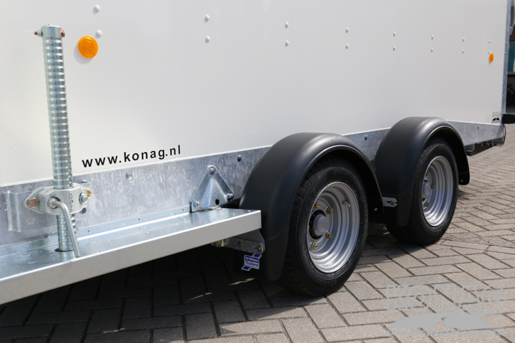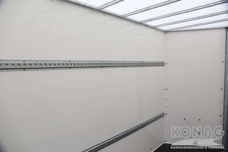 Het lichtdoorlatende dak zorgt voor natuurlijk licht in de laadruimte, wat het laden en lossen vergemakkelijkt. Steunpoten bieden stabiliteit wanneer de aanhangwagen niet aan een voertuig is gekoppeld en wielremmen met geïntegreerde terugrij automaat zorgen voor veiligheid tijdens het rijden. De verlichting van de aanhangwagen is voorzien van een geïntegreerd mistachterlicht en driehoek reflectie, waardoor uw veiligheid op de weg gewaarborgd is. De kogelkoppeling met een geïntegreerd slot, wat extra gemoedsrust biedt tijdens het transporteren van waardevolle ladingen.