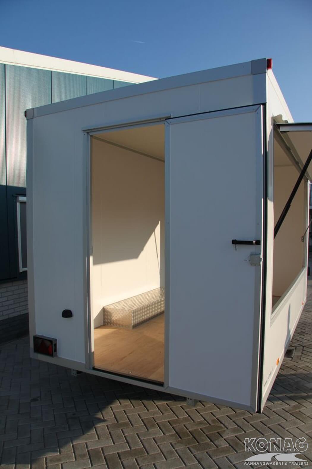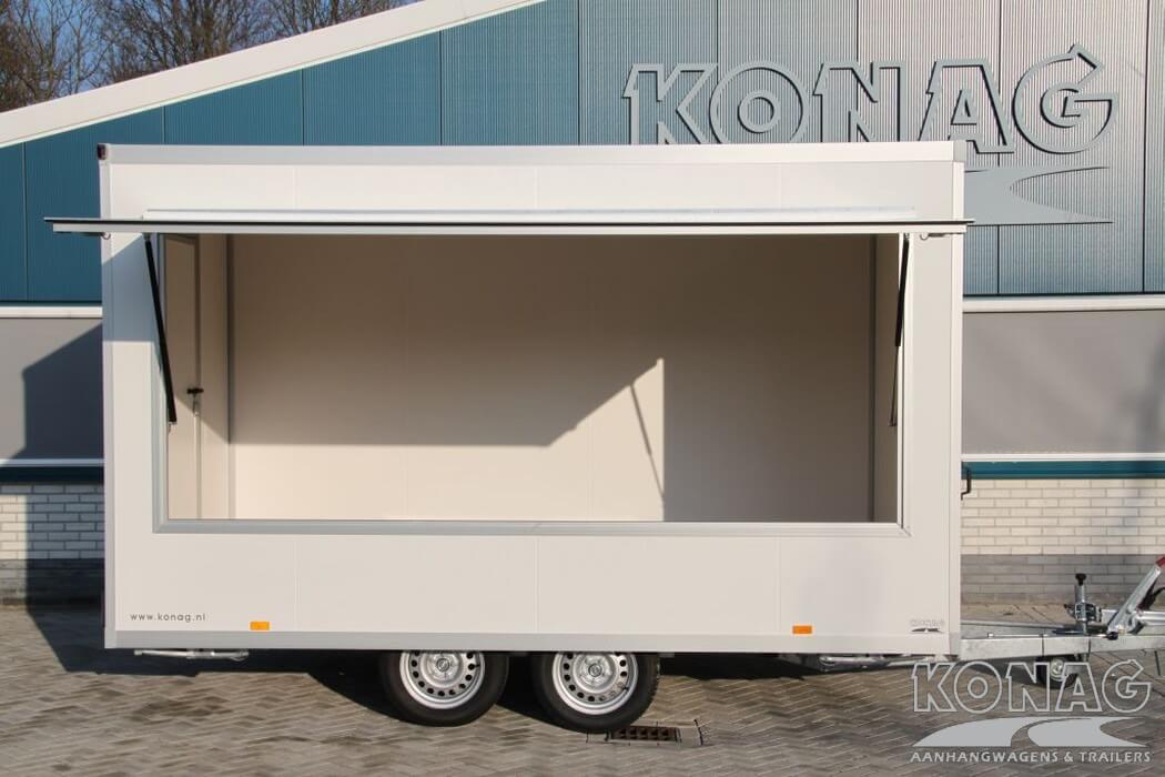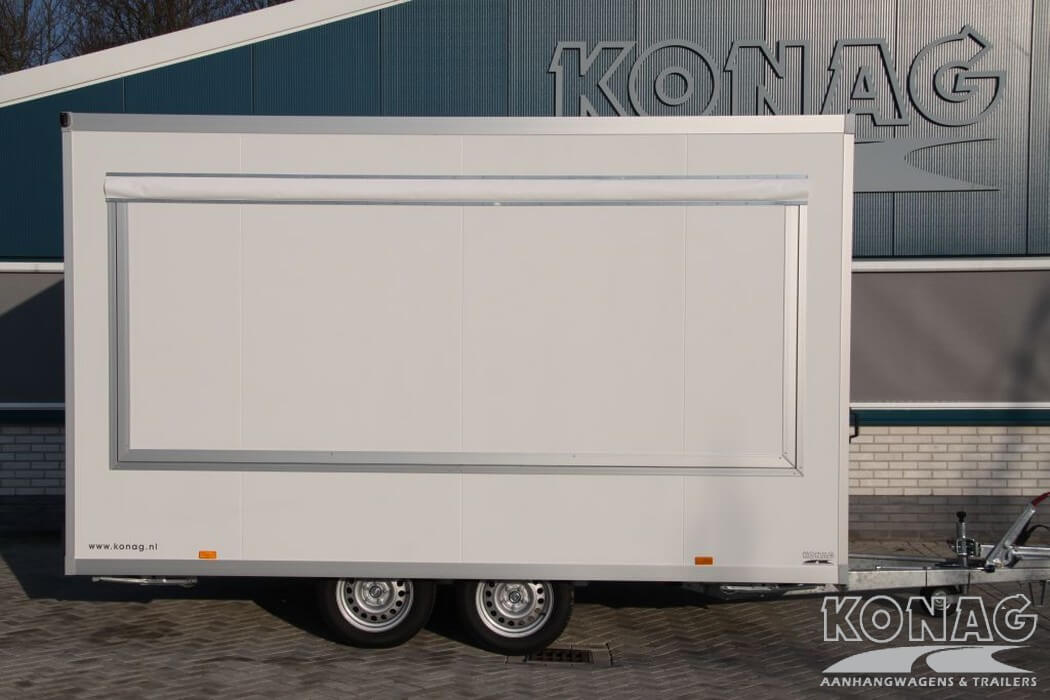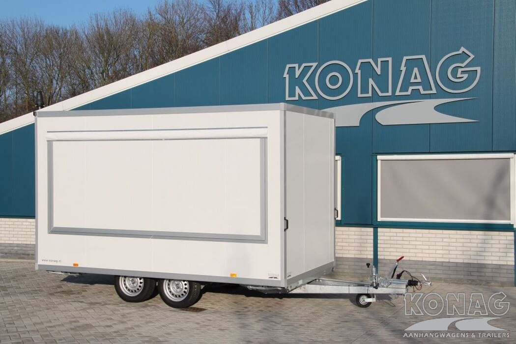 De Konag casco verkoopwagen met een lengte van 420 centimeter biedt ruimte voor uw marktactiviteiten. Het tandemas chassis zorgt voor een solide basis waarop gebouwd kan worden. De casco verkoopwagen is voorzien van een verkoopklep die van binnenuit vergrendeld kan worden en een ruime toegangsdeur in de achterzijde. Met een opbouw van witte sandwichpanelen een echte blikvanger. De verkoopwagen kan voorzien worden van een breed scala aan accessoires en opties, waaronder horeca-apparatuur, ovens en maatwerk gasinstallaties, deze verkoopwagen kunt u volledig aanpassen aan uw behoeften en voorkeuren.