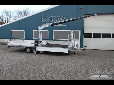 Grote Konag tridem plateau aanhangwagen met aanhangwagenkraan. Deze hydraulische kraan is volledige elektrisch / hydraulisch te bedienen.